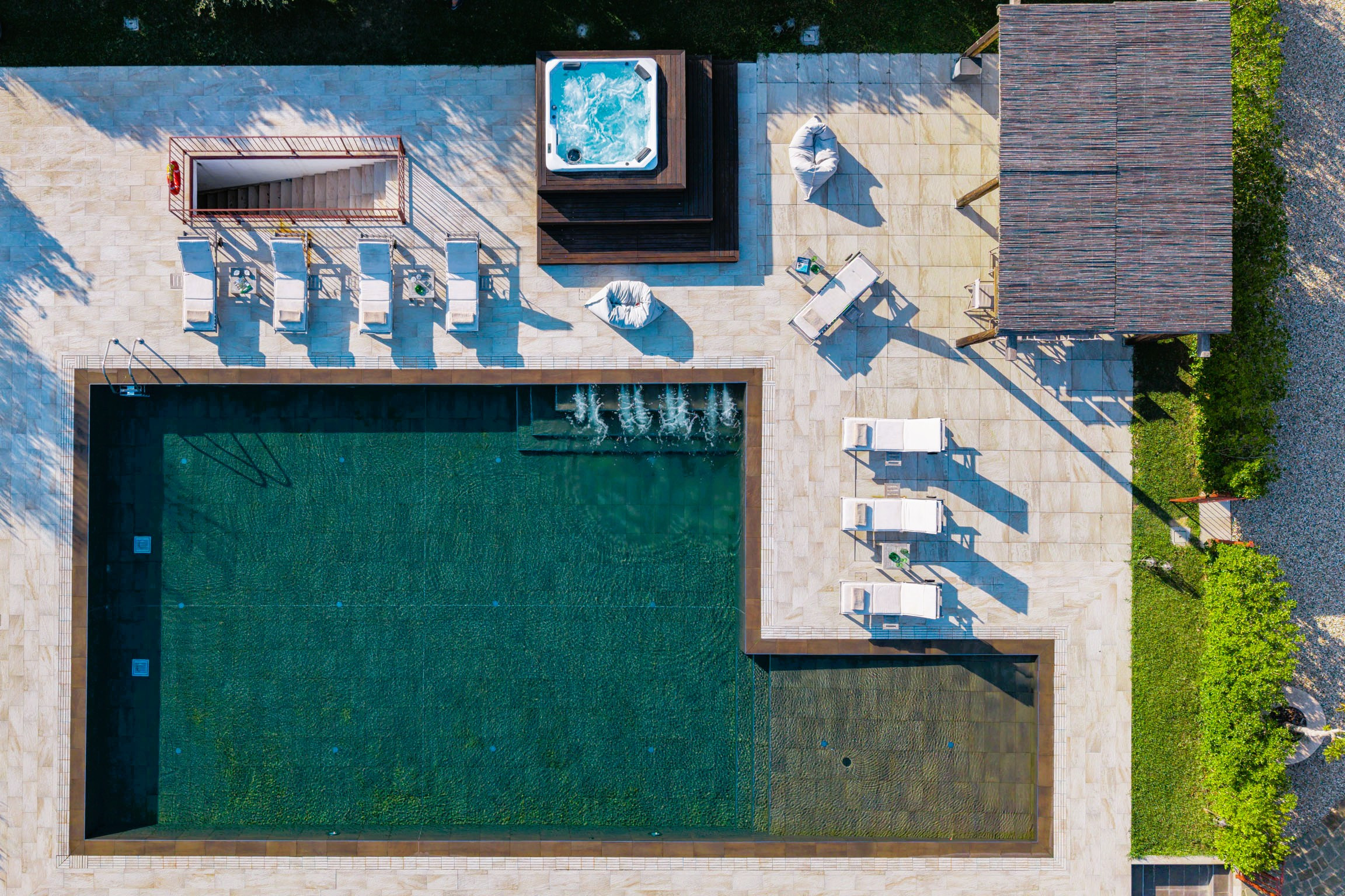 Ein atemberaubender Pool (max. 1,40 m tief) mit Treppe, Rutsche und Hydromassage. Direkt daneben befindet sich eine 120 m² große, voll ausgestattete Außenküche mit Essbereich und Stauraum. Ein Whirlpool für 6 Personen mit Blick auf die Weinberge ist ganzjährig geöffnet.