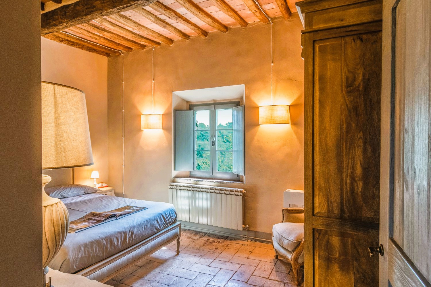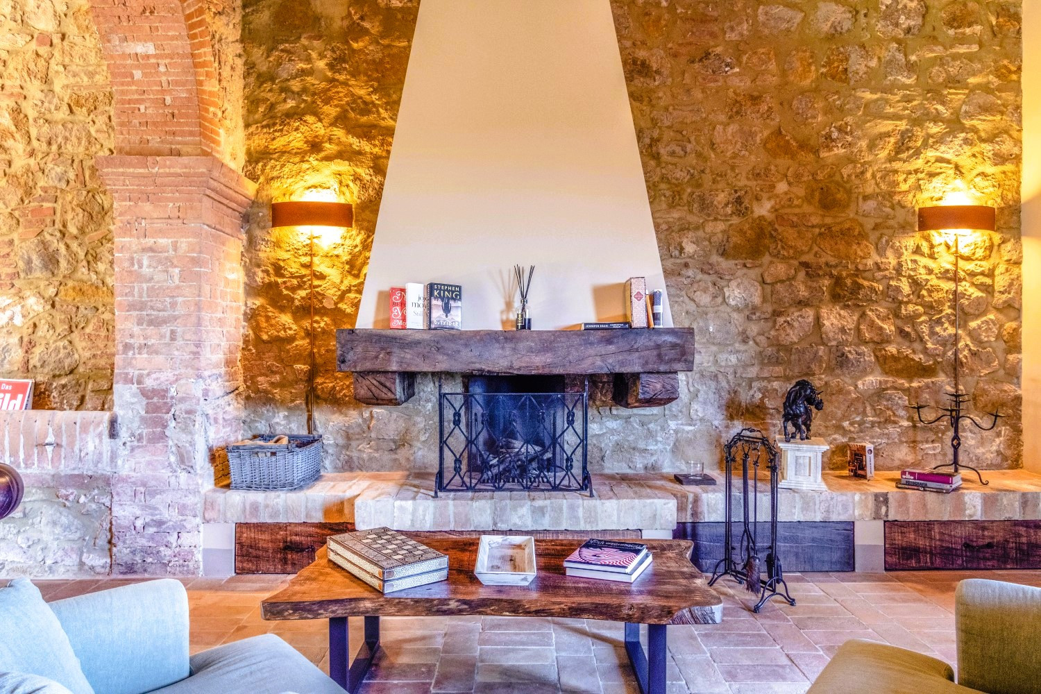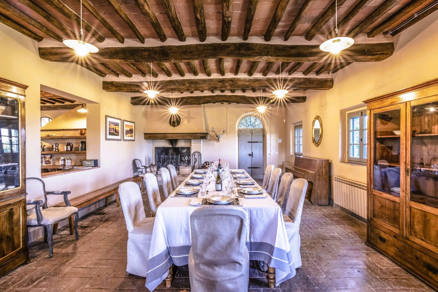 La propriété allie harmonieusement luxe contemporain et détails architecturaux classiques, avec ses carreaux de terre cuite traditionnels, ses poutres apparentes, ses cheminées en pierre et son mobilier sur mesure.