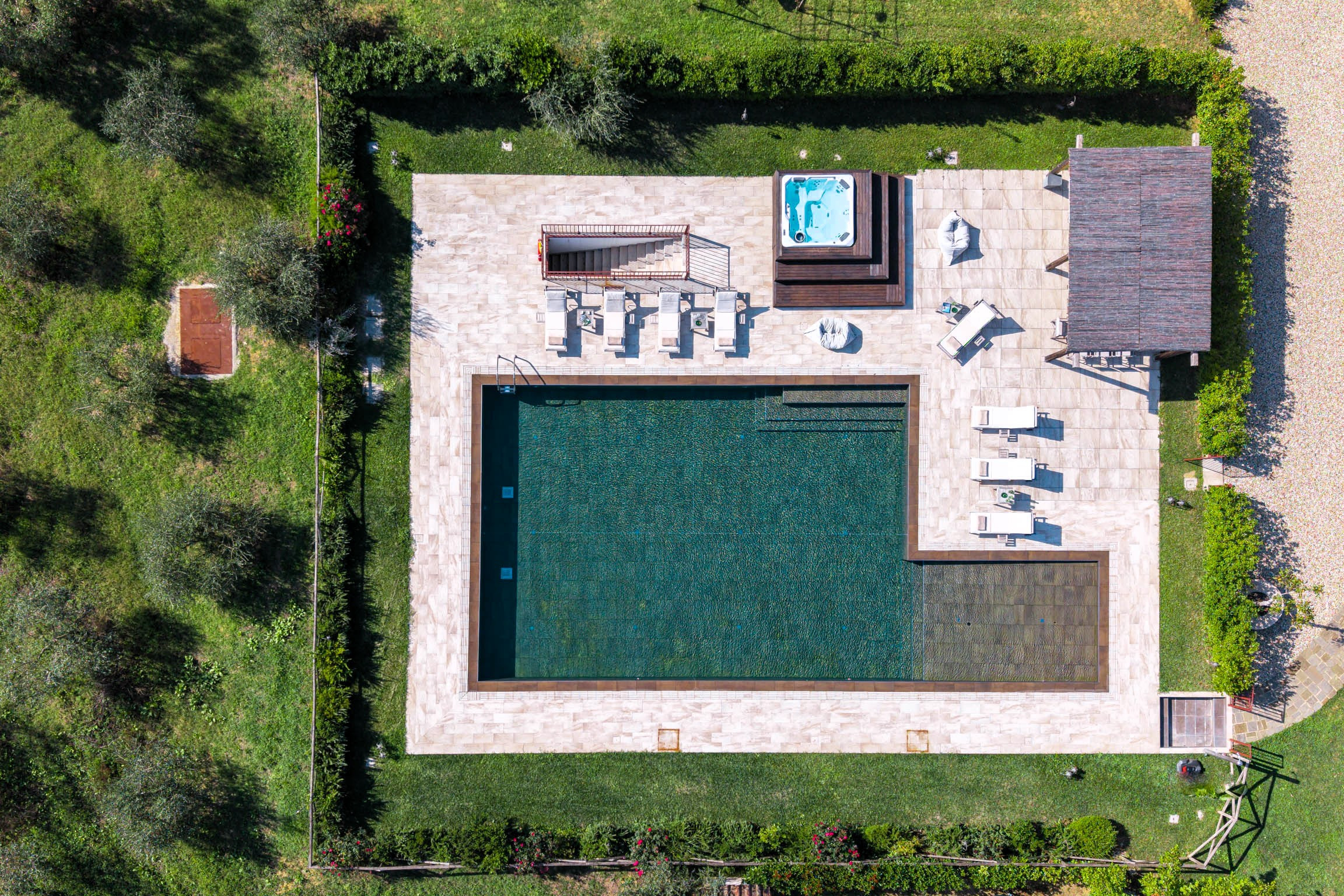 Une superbe piscine (1,40 m de profondeur maximum) avec escalier, toboggan et hydromassage intégré est à votre disposition. À côté, une cuisine d'été entièrement équipée de 120 m² comprend un coin repas et des espaces de rangement.