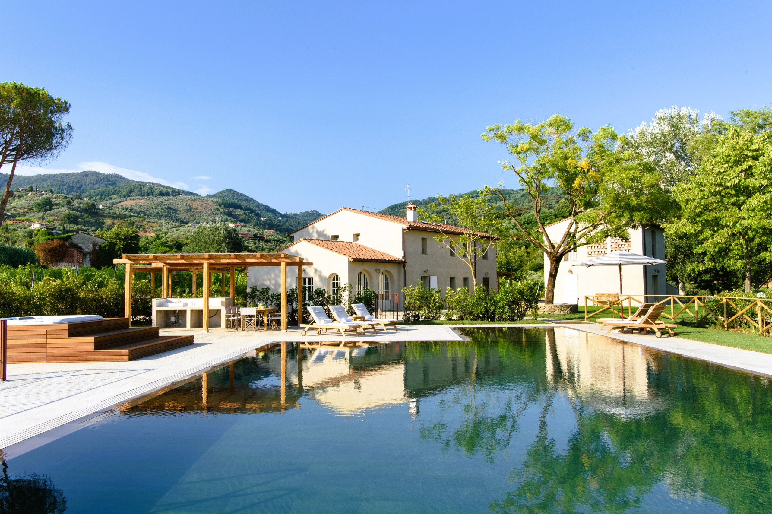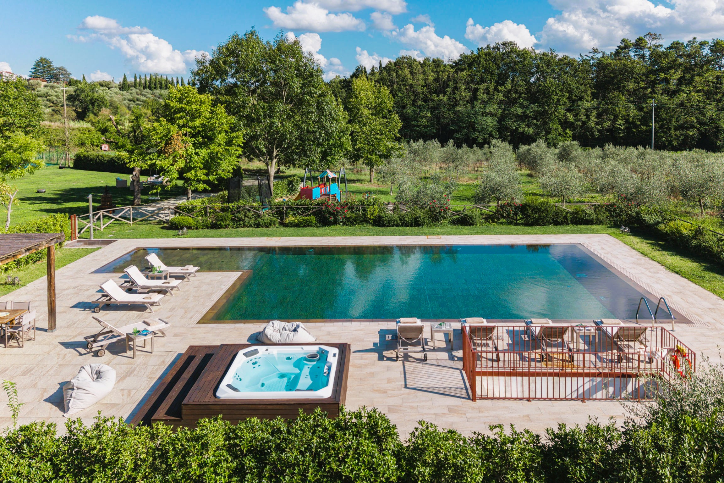 Una splendida piscina (max 1,40 m) con scale, scivolo e idromassaggio interno. Accanto, una cucina esterna di 120 mq completamente attrezzata con zona pranzo e ripostiglio.