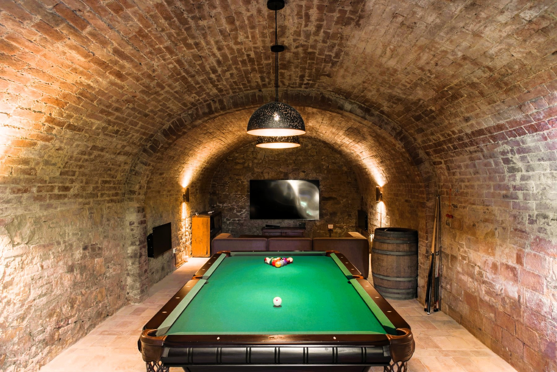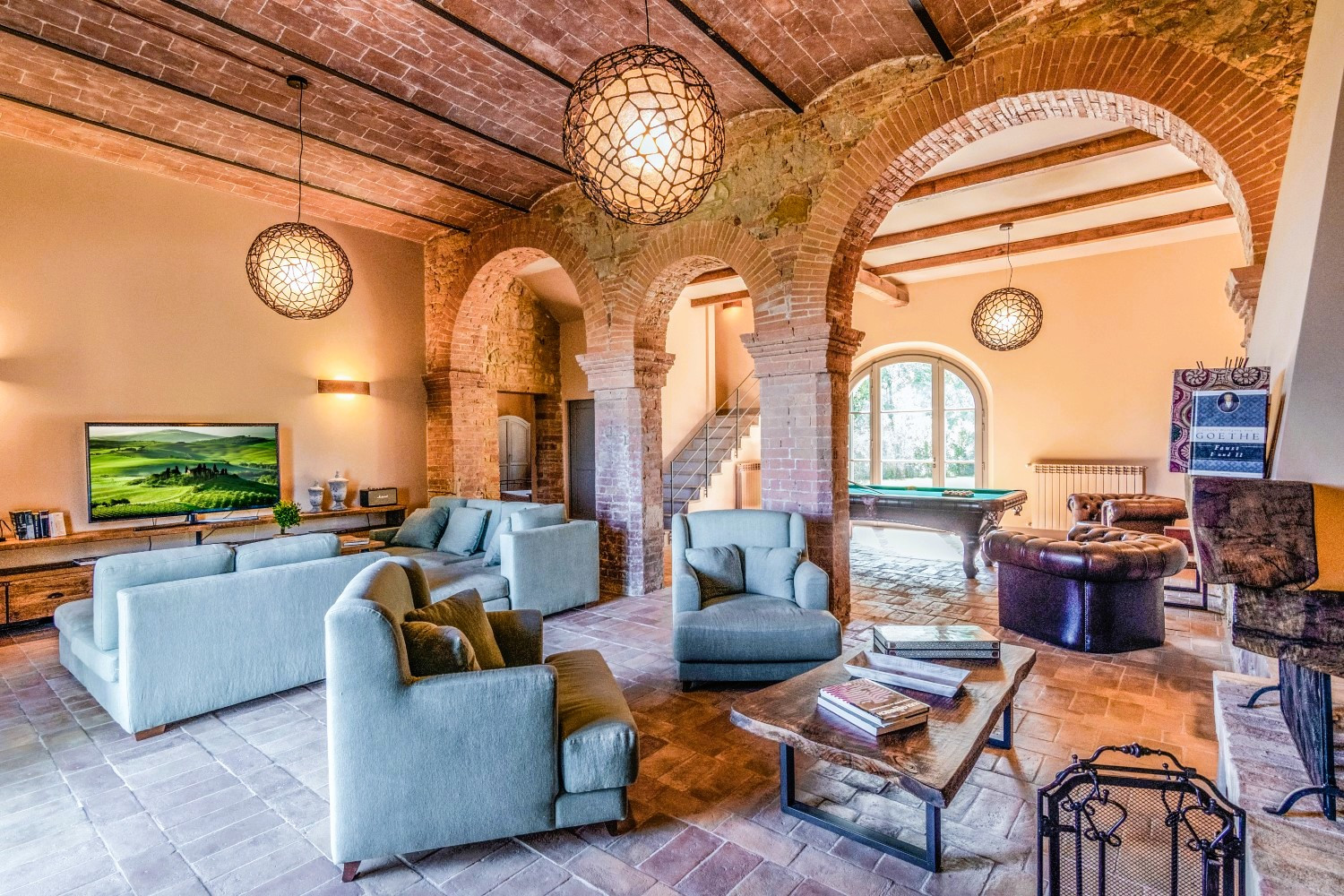 The spacious living area is designed for entertainment, offering a cozy fireside lounge and a dedicated game room equipped with a pool table and flat-screen TV.