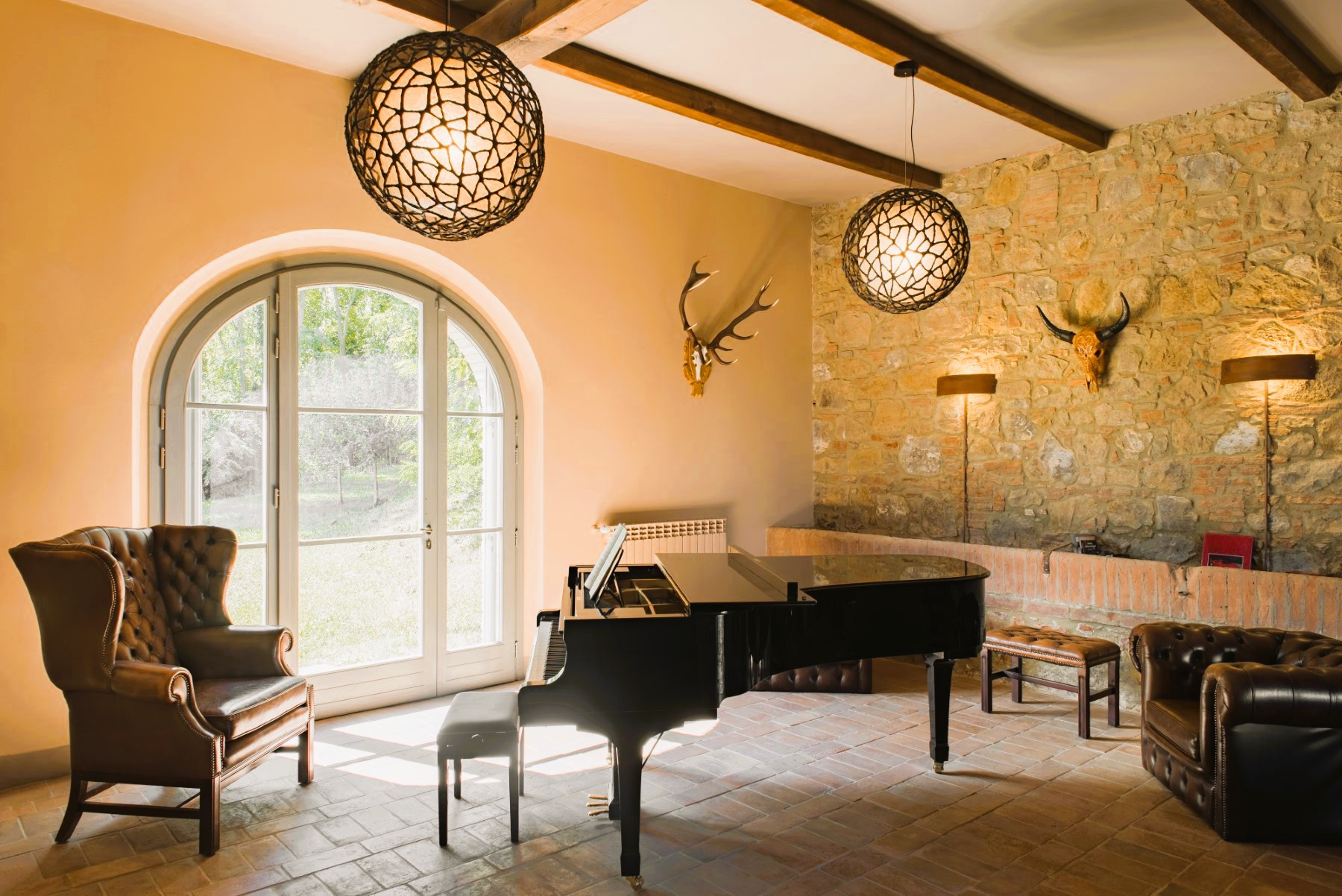 The property seamlessly blends contemporary luxury with classic architectural details, featuring traditional terracotta tiling, exposed timber beams, stone hearths, and bespoke furniture.